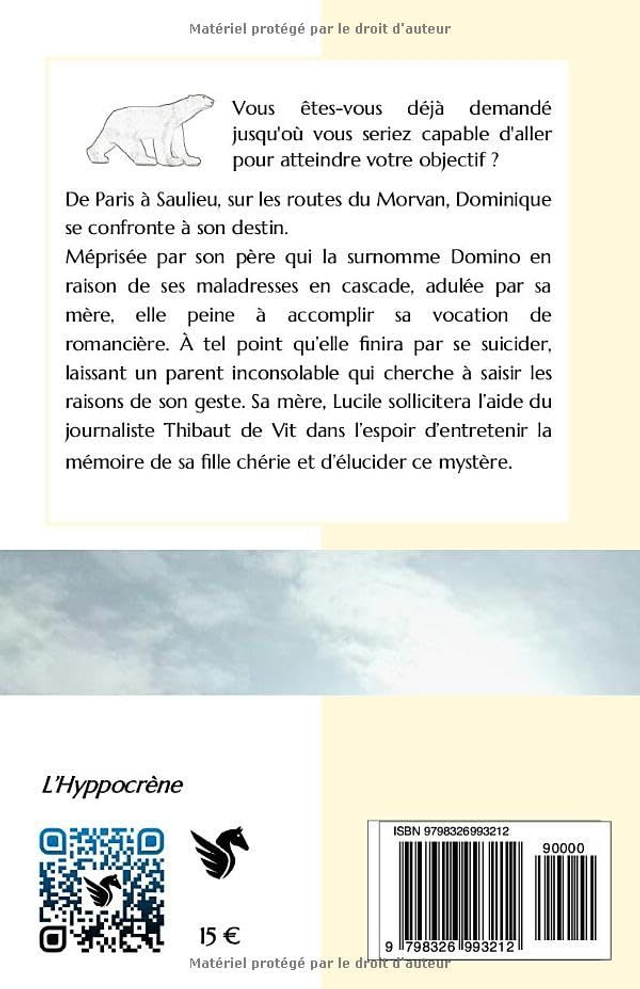 Méprisée par son père qui la surnomme Domino en raison de ses maladresses en cascade, adulée par sa mère, elle peine à accomplir sa vocation de romancière. À tel point qu’elle finira par se suicider, laissant un parent inconsolable qui cherche à saisir les raisons de son geste. Sa mère, Lucile sollicitera l’aide du journaliste Thibaut de Vit dans l’espoir d’entretenir la mémoire de sa fille chérie et d’élucider ce mystère.